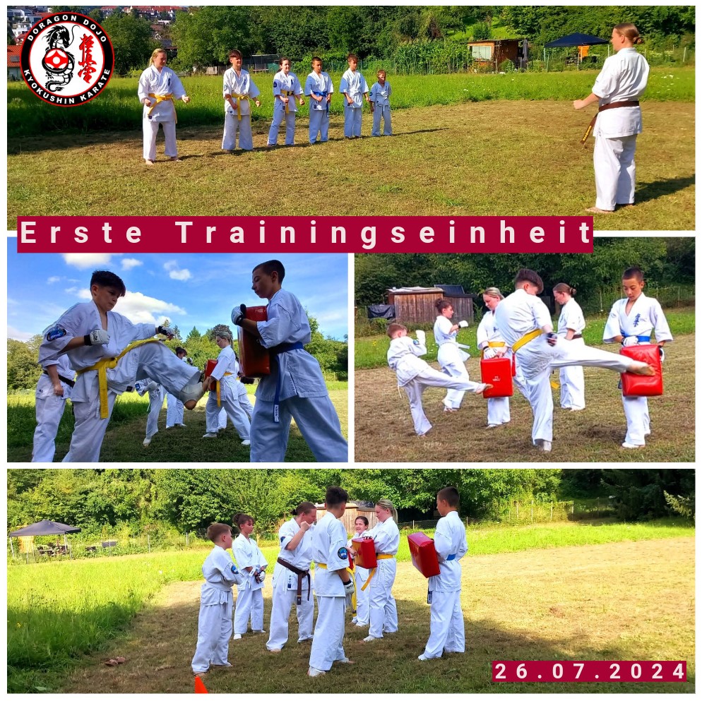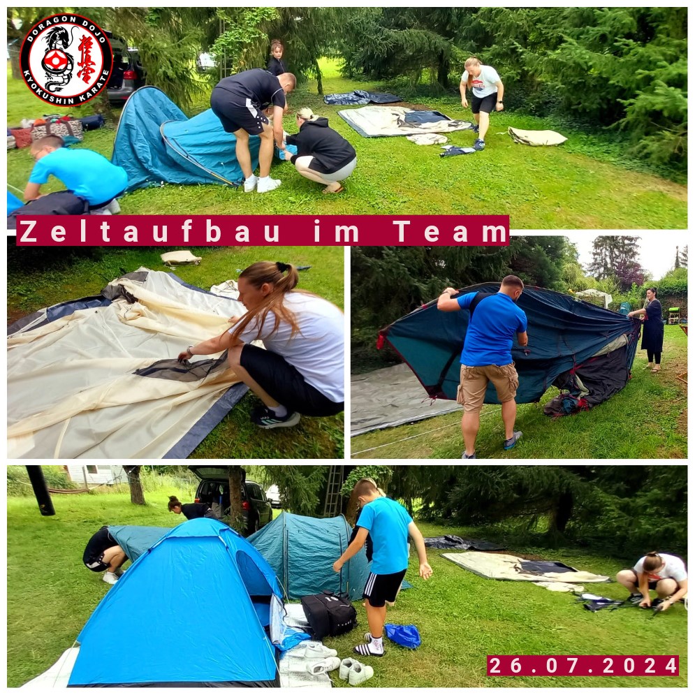 Für das Wettkampf-Team des Doragon Dojo fand vom 26.07. bis 31.07.24 erstmals ein Trainingslager statt. Sieben Kinder der Karate-Abteilung des TSV Weinsberg stellten sich voller Neugier der Herausforderung, ohne zu wissen, was sie erwarten würde. Am Anreisetag stand gleich die erste Teamaufgabe an: gemeinsam die Zelte aufzubauen. Mit Unterstützung der Betreuer und Eltern waren nach kurzer Zeit alle Zelte errichtet, und die Kinder konnten sich sofort auf das erste Training vorbereiten. Dieses umfasste hauptsächlich Fitnessübungen, grundlegende Techniken und Pratzentraining. Nach zwei Stunden war die erste Einheit abgeschlossen, und alle freuten sich auf das Abendessen. Das Abendprogramm bestand aus verschiedenen Kennenlernspielen, die für alle Anwesenden äußerst unterhaltsam und spannend waren.