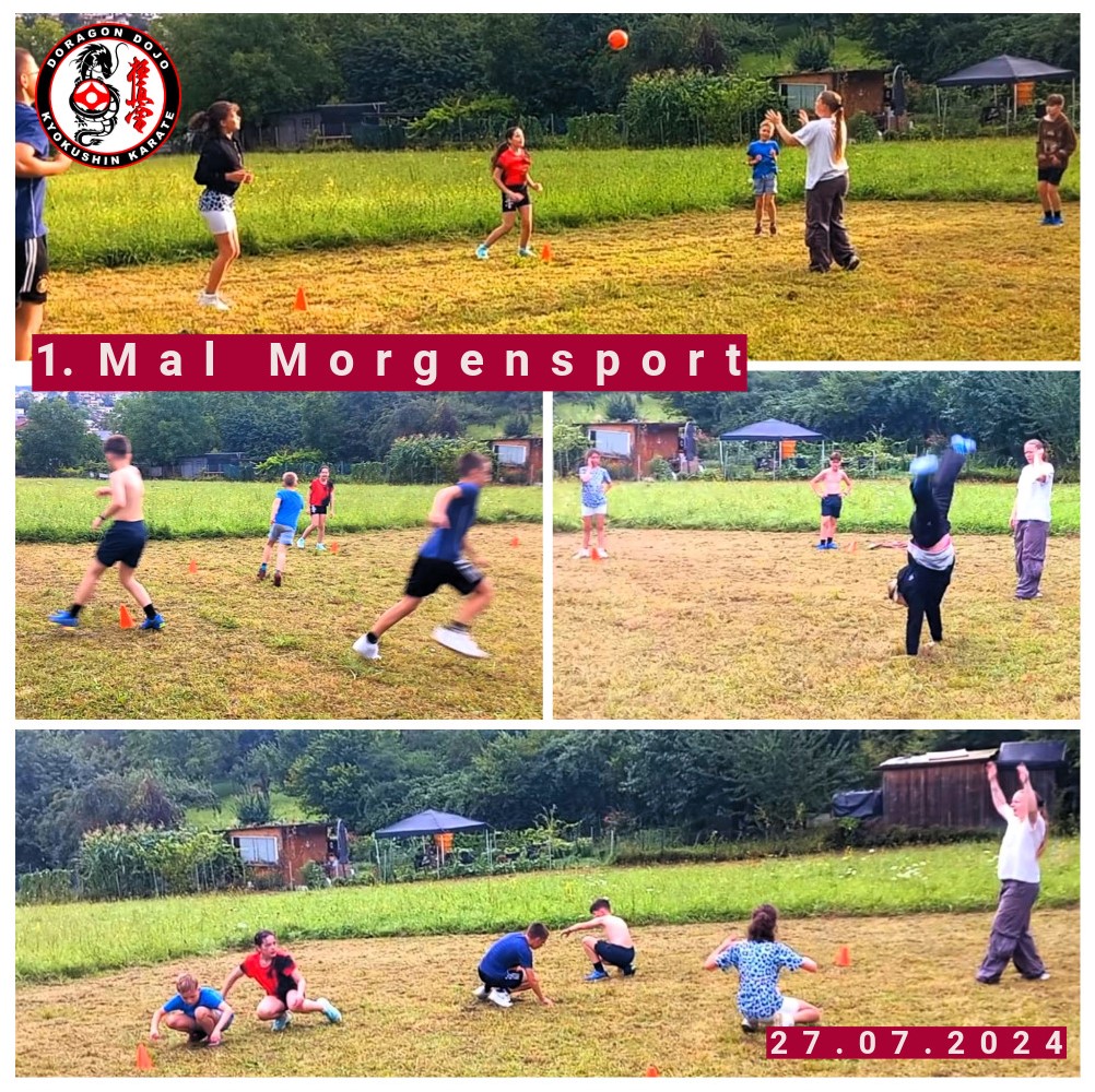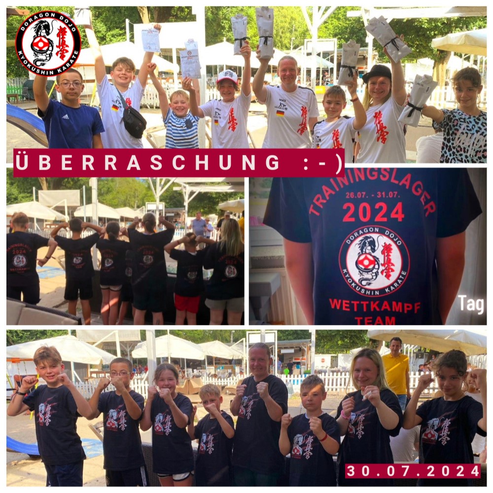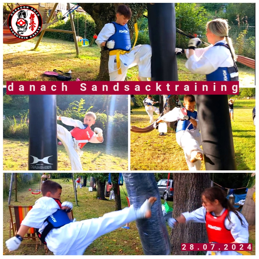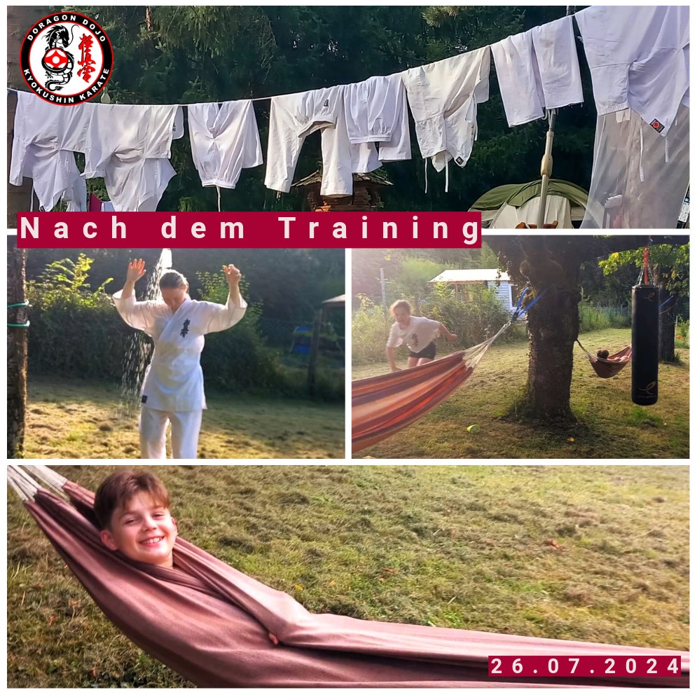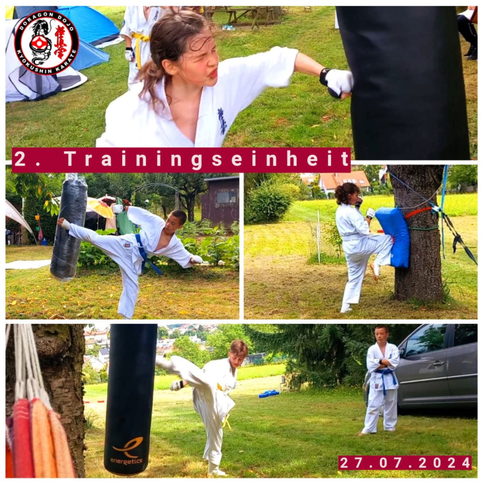 Nach einer regnerischen Nacht begann der zweite Tag mit Morgensport, während unsere Betreuer das Frühstück zubereiteten. Nach dem Frühstück fand die erste Trainingseinheit bei leichtem, sommerlichem Regen statt, bei der der Schwerpunkt auf intensivem Kata-Training lag. Alle waren überrascht, wie viel Freude eine Trainingseinheit im Sommerregen bereiten kann und fanden es großartig. In der zweiten Trainingseinheit am Nachmittag konzentrierten wir uns auf Pratzen- und Sandsacktraining. Jeder gab sein Bestes und übertraf seine eigenen Erwartungen, was viele stolz machte. Am Abend gab es dann Hamburger, die jeder nach Belieben belegen konnte, was zu den kreativsten Kreationen führte ;-) Nach dem Abendessen fand in gemütlicher Runde eine Theoriestunde statt. Müde gingen wir anschließend ins Bett.