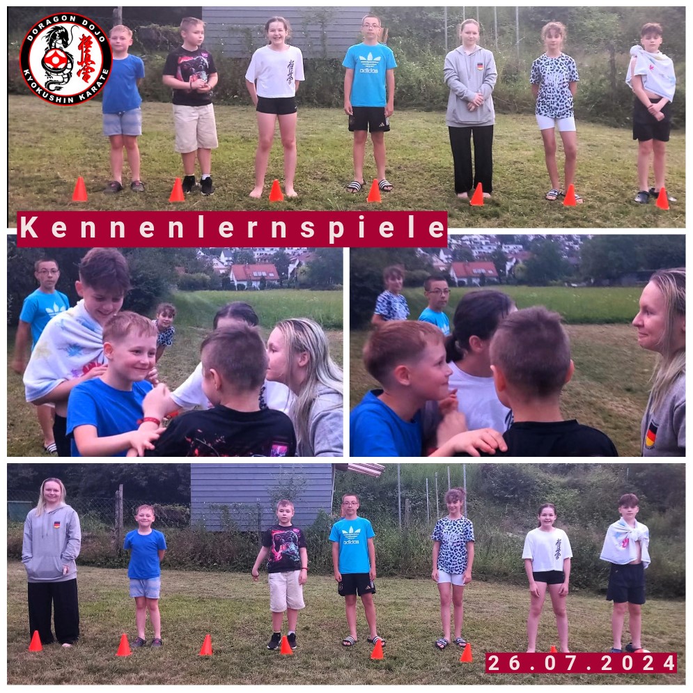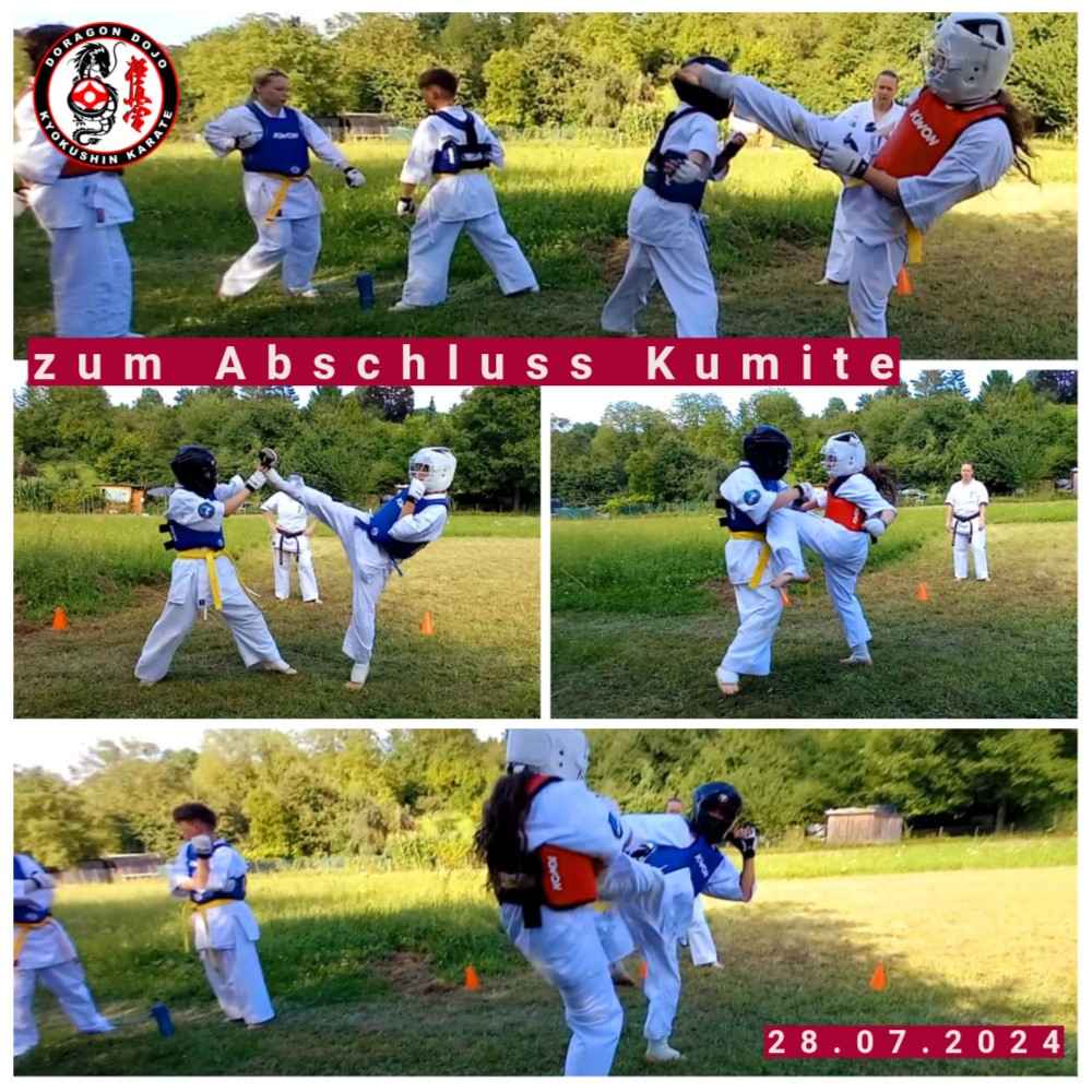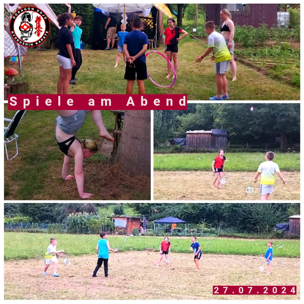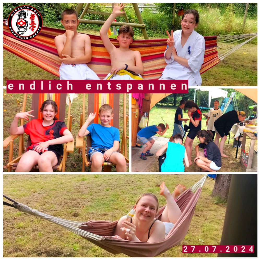 Tag vier war ein ganz besonderer Tag. Nach Morgensport und Frühstück halfen alle bei den Vorbereitungen für den gemeinsamen Grillabend mit Eltern und Mitgliedern. Es wurden Stöcke für Stockbrot geschnitzt, Folienkartoffeln vorbereitet und alles aufgeräumt. Dann begann auch schon die erste Trainingseinheit für unsere Anfänger. Wir waren mittlerweile bei Kata Nummer 3 angekommen, die nun gefestigt werden sollte. Anschließend trainierten unsere fortgeschrittenen Kinder Koordination, Ausdauer, Fitness und Gleichgewichtsübungen. Zur Trainingseinheit am Nachmittag luden wir alle Mitglieder der Karate-Abteilung zu einem offenen Training ein, das aus Kihon (Grundtechniken), Pratzentraining, Gleichgewichtsübungen, Kumite und Ausdauertraining bestand. Danach freuten sich ALLE auf den gemeinsamen Grillabend, besonders die Kinder darüber, dass ihre Eltern dabei waren. Es war ein sehr ereignisreicher, emotionaler und anstrengender Tag für uns.