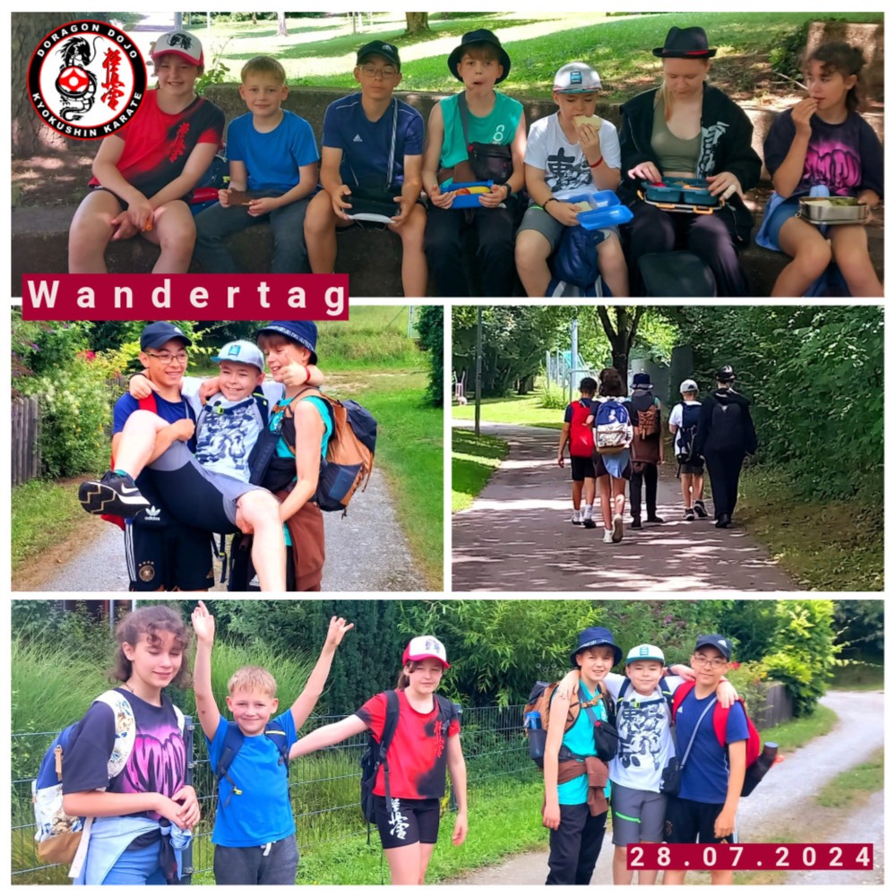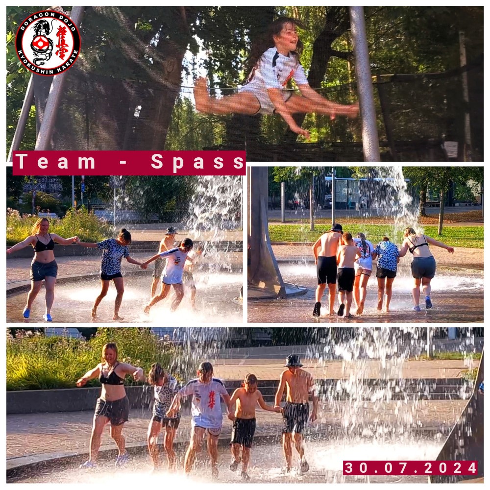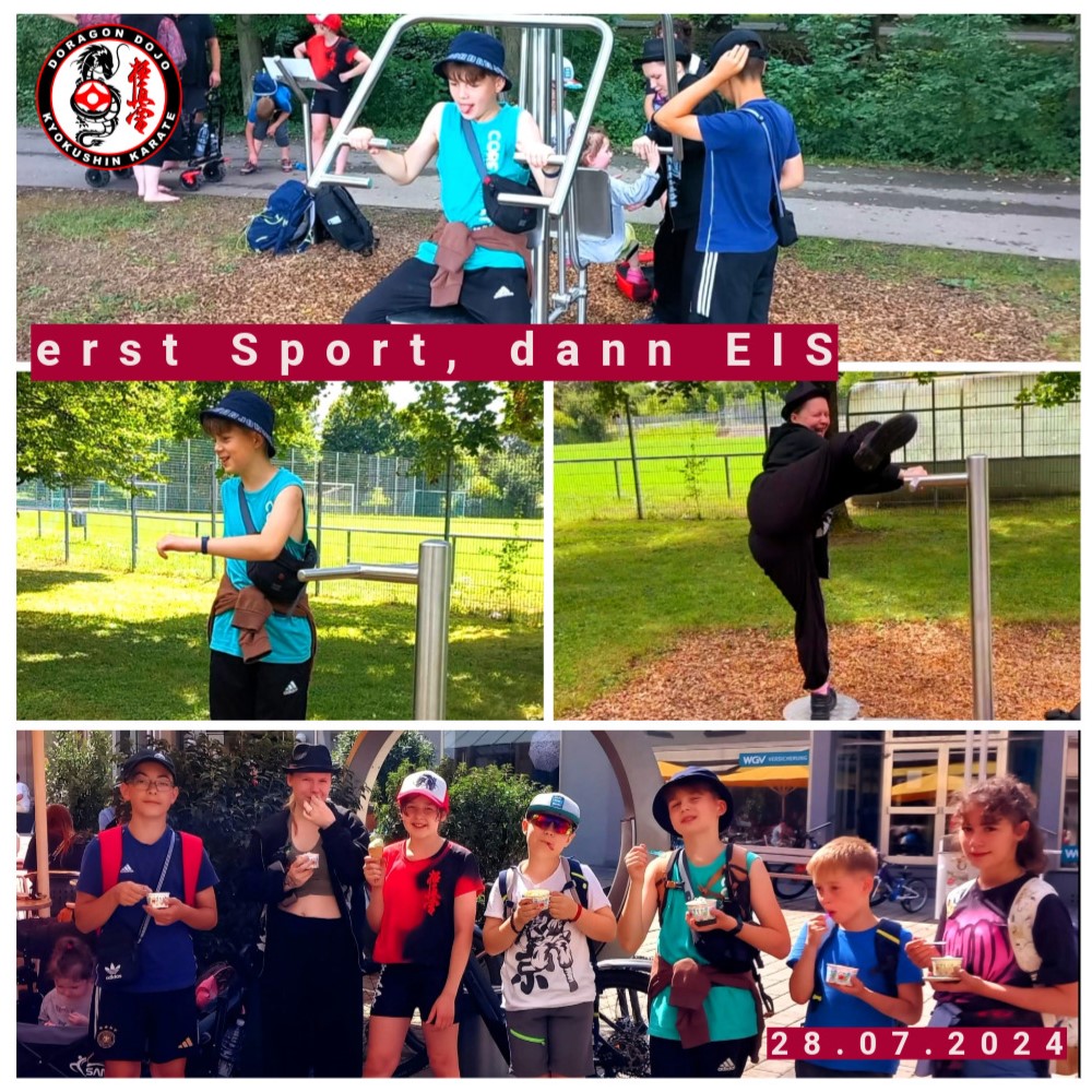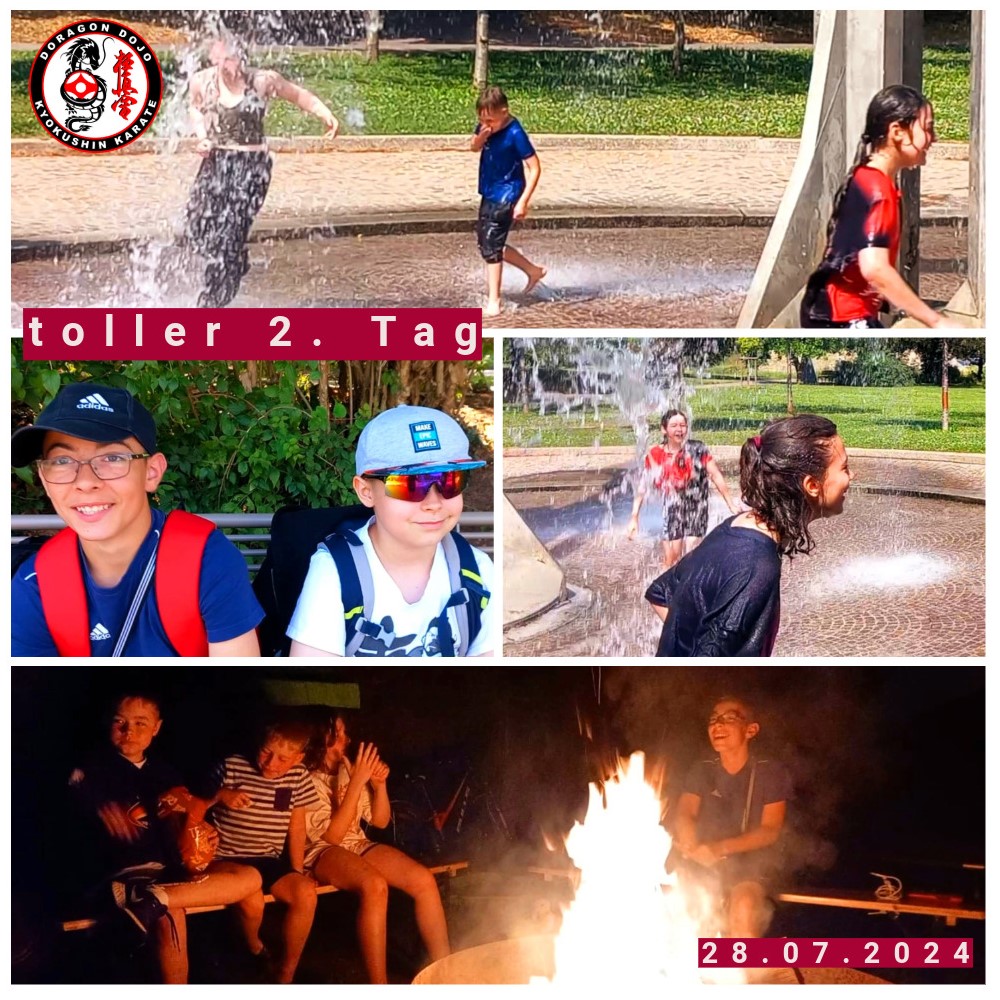 Am dritten Tag war eine Wanderung in die Umgebung geplant. Ziel war ein Park mit Outdoor-Fitness-Geräten und einem Spielplatz. Nachdem das Team nach drei Stunden erschöpft den Rückweg antrat, liefen wir zufällig (oder vielleicht auch absichtlich ☺) an einer Eisdiele vorbei. Die Karate-Abteilung lud nun alle zu einem Eis ein... Juhuu! Zum Abschluss der Wanderung genossen die Kinder bei sommerlichen Temperaturen das kühle Nass des Parkbrunnens. Auch hier hatten alle sehr viel Spaß. Als wir zurück in der Unterkunft waren, fand noch eine zweistündige Sandsack- und Kumiteeinheit statt. Am Abend verbrachten wir in fröhlicher Runde einen Spieleabend am Lagerfeuer.