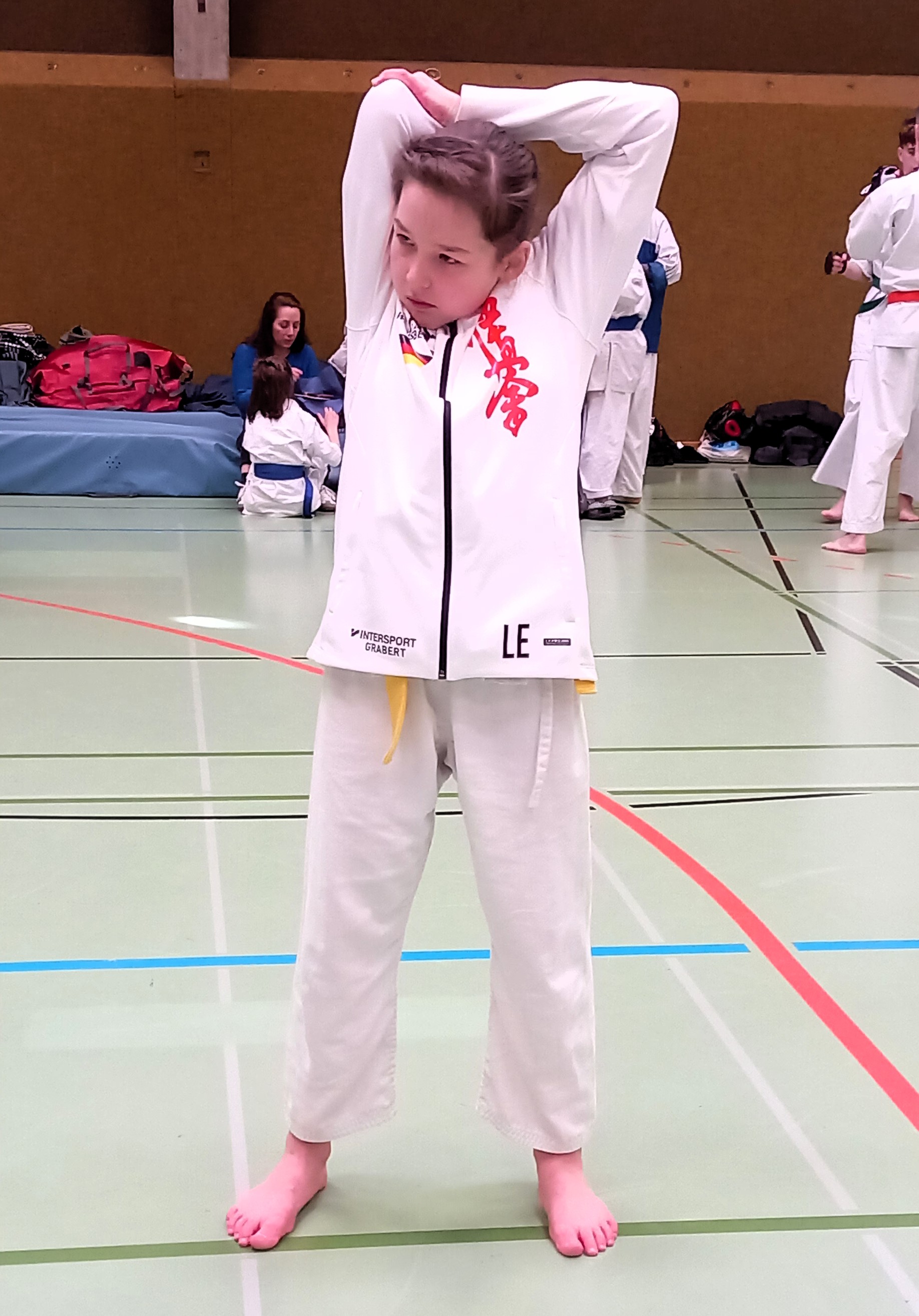 Liana Ertel, startete im Kumite (Kampf) in 2 verschiedenen Gewichtsklassen ihrer Altersgruppe. Vieles aus den vergangenen Trainingseinheiten konnte sie im Kampf bereits umsetzen. In allen Kämpfen zeigte sie einen starken Kampfeswillen, ignorierte harte Treffer und versuchte permanent vorwärts zu gehen, was nicht immer einfach war. Liana holte sich verdient in der Kategorie