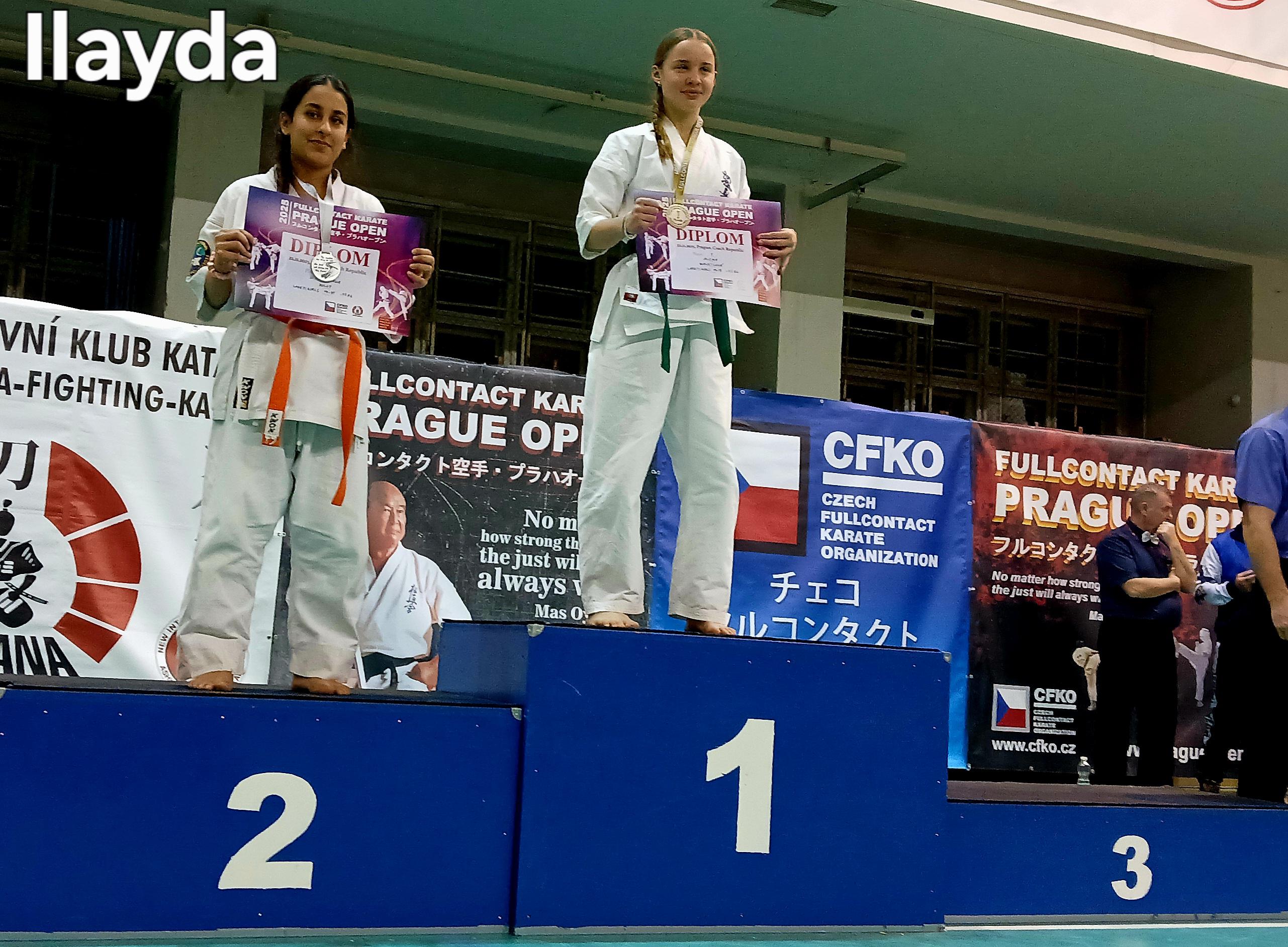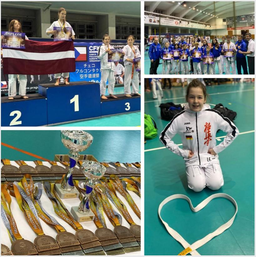 Am 16.11. reiste unsere Kämpferin Liana Ertel zu den Fullcontact Karate Prague Open 2024. An diesem großen Turnier nahmen 240 Kämpfer aus Tschechien, Isreal, Belgien, Polen, Usbekistan, Lettland, Ukraine und Deutschland teil. Liana startete mit ihren 10 Jahren diesmal in der höheren Kategorie bei den Mädchen 12-13 Jahren, um Erfahrungen für die kommende Weltmeisterschaft zu sammeln. Im ersten Kampf traf Liana auf eine Tschechin. Diesen Kampf dominierte sie klar und konnte ihn durch gezielte Treffer vorzeitig nach einem Punktsieg gewinnen. Im nächsten Kampf traf sie auf ein Mädchen aus Lettland. Diese war schon 13 Jahre, größer und gefühlt schwerer als es die Kategorie vorsah. Aber man kann sich die Gegner nicht aussuchen und muss darauf vertrauen, das alle Trainer ihre Schützlinge ordnungsgemäß anmelden. Was leider nicht immer der Fall ist. Liana kämpfte auch hier wieder unbeirrt. Sie versuchte, ihre Gegnerin, die dann die Gewinnerin dieser Kategorie wurde, zu treiben und schlug und trat. Leider sind 2 Fauststöße durchgekommen und die Kampfrichter gaben der Lettin den Punkt. Somit kam Liana am Ende auf einen sehr guten 3. Platz.