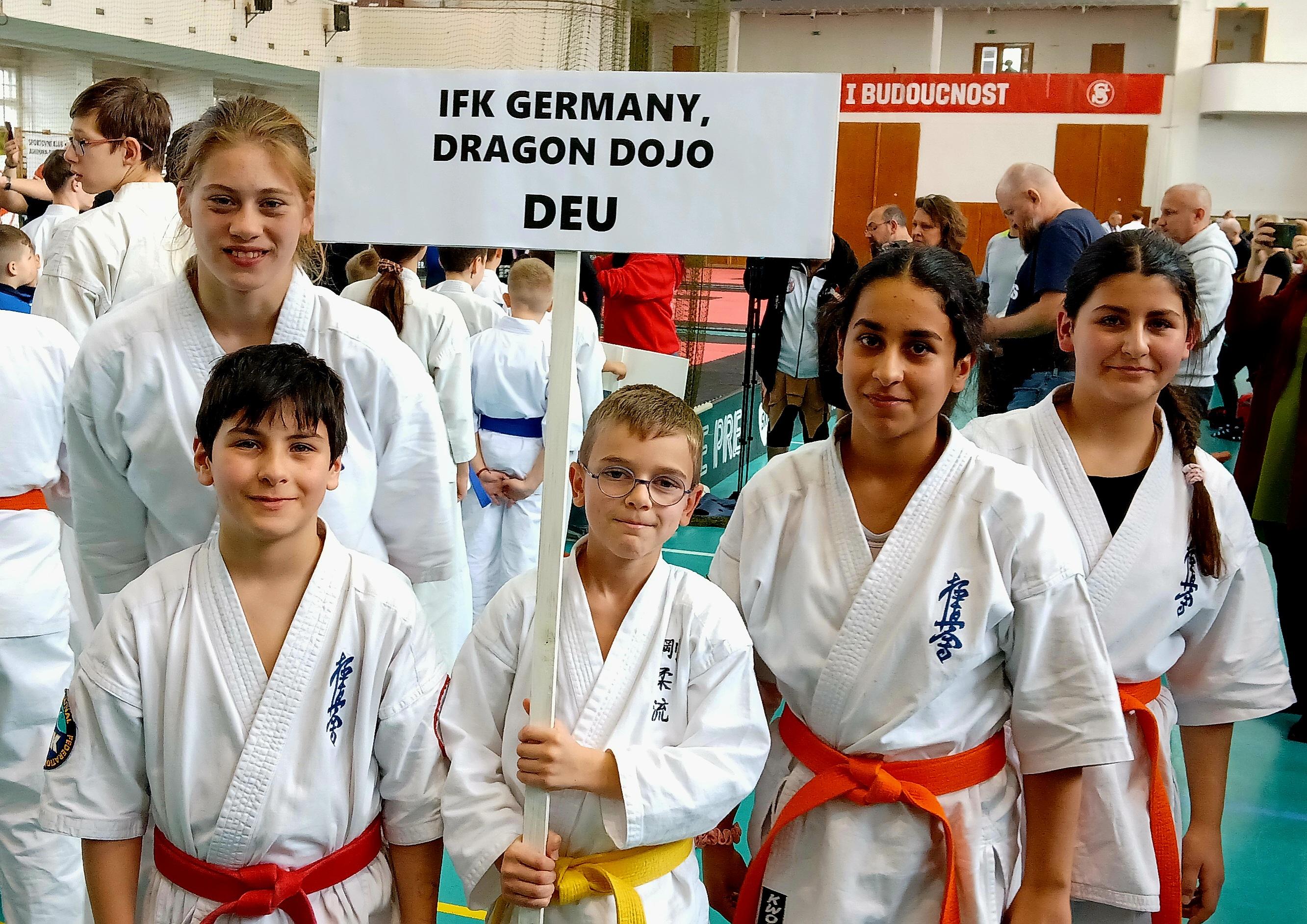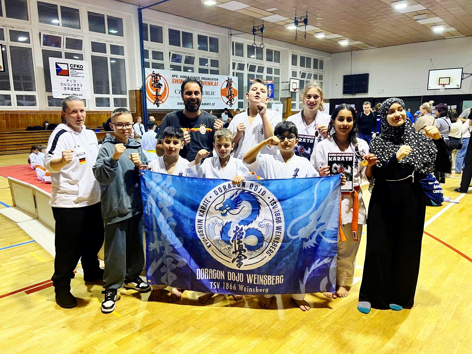 Am 6.12.2025 sind 7 Kämpfer mit Coach, Betreuer und Eltern nach Sokolov/Tschechien gereist, um an der tschechischen Kumite-Liga teilzunehmen. Angereist waren über 100 Kämpfer aus ganz Tschechien, der Ukraine sowie 3 Vereinen aus Deutschland. Ahmad Khabisa, Daniel Klaus, Daniel Stenke und Ali Malik Emul hatten im ersten Kampf zu erfahrene Gegner und trotz aller Bemühungen und starkem Kampfwillen mussten sie sich dem Sieg geschlagen geben. Turan Selim Bulut startete hoch motiviert in einer offenen Gewichtsklasse. Hier war sein erster Gegner über 20 Kilo schwerer. Turan hat trotzdem stark gekämpft, viele Kombinationen angewendet und bis zum Schluss alles versucht. Aber ein Sieg blieb ihm leider verwehrt. Merle Krüger konnte ihre ersten beiden Kämpfe klar gewinnen. Im dritten Kampf, der sehr ausgeglichen war, kassierte sie kurz vor Schluss einen Treffer, und die restliche Kampfzeit war zu kurz, um dies auszugleichen. Im kleinen Finale um Platz 3 gewann sie durch K. O. und stand damit sehr verdient auf dem Siegerpodest. Ilayda Tuana Bulut holte im ersten Kampf ebenfalls einen Sieg. Im Halbfinale kämpfte sie gegen eine starke Gegnerin und hat ununterbrochen gute Kombinationen gemacht. Ihre Gegnerin kam leider einmal mit einem Fußtritt durch und erhielt einen Punkt. Das kostete Ilayda den Sieg und für sie war auch nur noch der Kampf um Platz 3 möglich. Ihre starken Techniken verhinderten allerdings, dass ihre Gegnerin im Finale kämpfen konnte. Im kleinen Finale gewann Ilayda klar durch K. O. und, wie Merle, stand sie hochverdient auf dem Treppchen. In Tschechien zu kämpfen ist eine große Herausforderung, und unsere Kinder können sehr viele Erfahrungen sammeln. Wir sind sehr stolz auf unsere 7 Kämpfer. Sie haben alles gegeben, nicht aufgegeben und bis zum Schluss gekämpft. Das zeigt einen starken Kampfgeist und Siegeswillen. Wir danken den mitgereisten Eltern für ihre großartige Unterstützung sowie Serhat Bulut, dass er unsere Trainerin Manu Hemmann als Co-Trainer unterstützt hat, wenn 2 Kinder vom Doragon Dojo Weinsberg gleichzeitig gekämpft haben. Jetzt freuen wir uns erst mal auf Weihnachten und atmen durch, bis es im Januar mit den nächsten Wettkämpfen weitergeht.